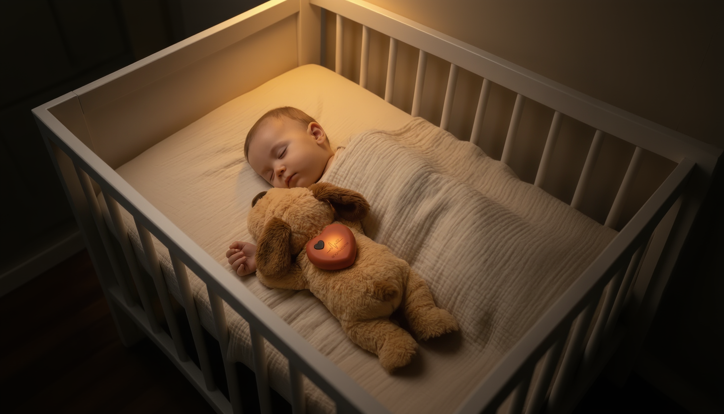 Insérez BOOM-BOOM dans n'importe quelle peluche — celle que votre bébé aime déjà, celle qui sent comme vous. Pas besoin d'en acheter une nouvelle.