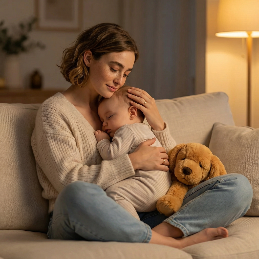Posez bébé avec son doudou. Il reconnaît le son. Son rythme cardiaque ralentit. Il s'apaise. Il s'endort. Et vous aussi.